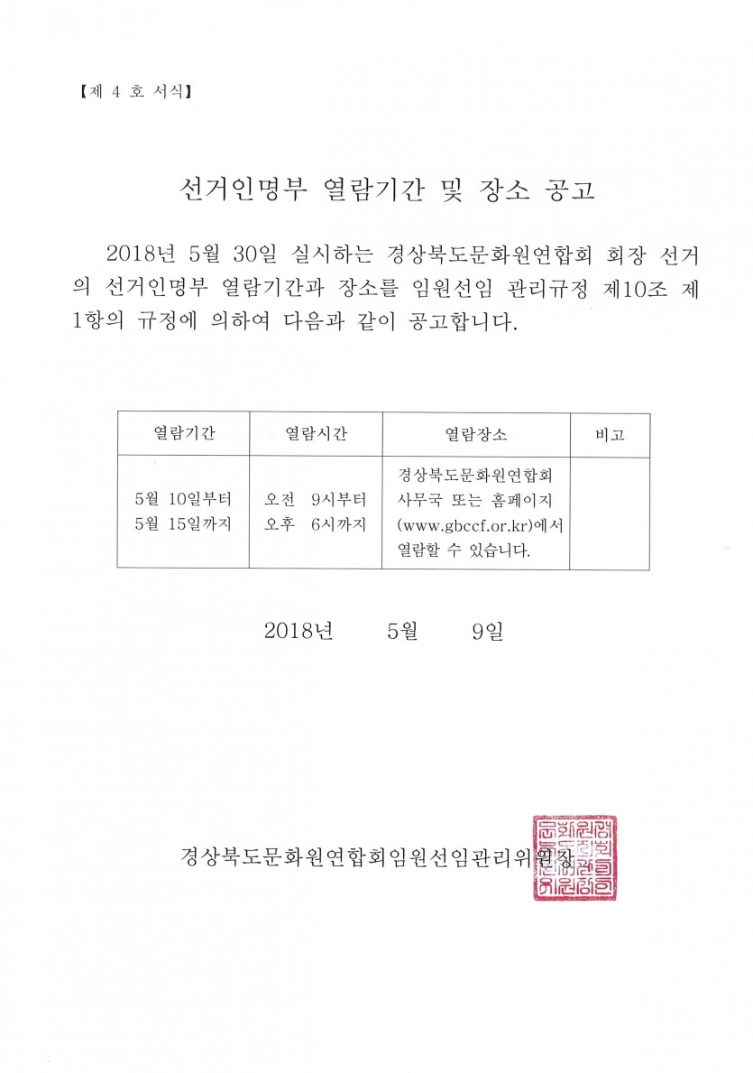 제17대 경상북도문화원연합회 회장 선거의 선거인명부 열람기간 및 장소 공고